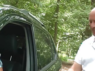 "Busty milf wearing fishnets gets banged in car"
